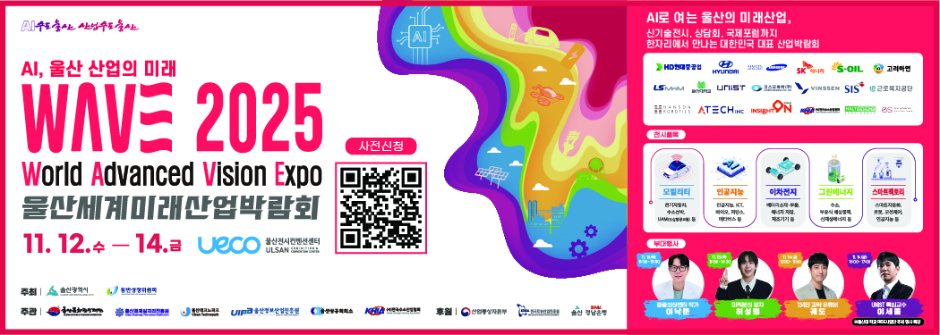 울산광역시 및 동반성장위원회가 주최하고, 울산문화관광재단, 울산상공회의소 등 6개 기관이 공종주관하는 'WAVE 2025(울산세계미래산업박람회)'가 오는 11월 12일부터 14일까지 울산전시컨벤션센터에서 개최될 예정입니다. 본 행사는 신기술 전시회, 수출.구매상담회, 국제포럼 등으로 구성되며, 제조.에너지.모빌리티.AI 등 미래산업 분야의 신기술이 한자리에 모이는 네트워킹의 장이 될 것입니다. |