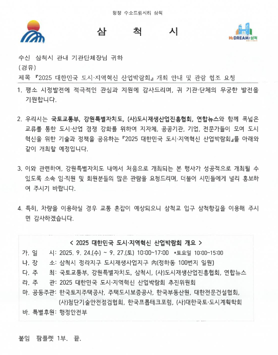 ‒ | 2025 대한민국 도시지역혁신 산업박람회 개최 안내 및 관람 협조 요청 |