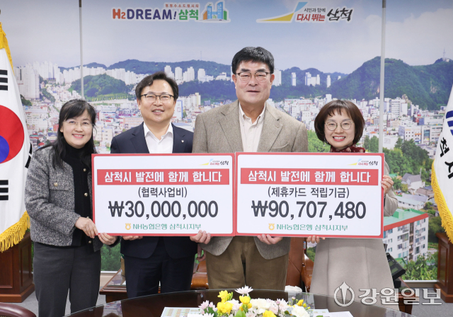 ![]() NH농협 삼척시지부(지부장:금석환)는 25일 제휴카드 적립기금 9,070만7,480원과 협력사업비 3,000만원 등 1억2,070만7,480원을 삼척시에 기탁했다. |